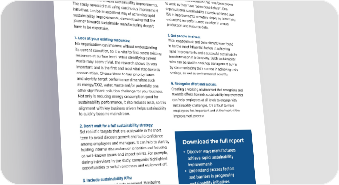 SUSTAINABILITY SPOTLIGHT | 10 Six sustainable actions you can take now 4. Start small: BE A CHANGEMAKER The IfM talked to practitioners from a range of A simple yet eective variation is to approach teams global manufacturing firms, as well as sustainable that can look straight away at the dierence between manufacturing experts, to identify common success energy used on good days and bad days. Teams can IN SUSTAINABLE factors and best practices in businesses that had identify ideas and processes that have been proven achieved consistent, rapid sustainability improvements. to work as they have “been done before”. One MANUFACTURING The study revealed that using continuous improvement organisational sustainability example achieved over initiatives can be an excellent way of achieving rapid 15% in improvements remotely simply by identifying sustainability improvements, demonstrating that the and acting on performance variation in annual journey towards sustainable manufacturing doesn’t production and resource data. The Sustainability This is no small feat. The sustainability field is complex and fraught with uncertainty. And the rate of change is accelerating. have to be expensive. 5. Get people involved: Association is Organisational resistance to change can be significant and Wide engagement and commitment were found looking for leaders presenting a convincing case to the board can feel daunting. 1. Look at your existing resources: to be the most influential factors in achieving No organisation can improve without understanding rapid improvements and a successful sustainability who want to drive That’s why we’ve started the Sustainability Association. its current condition, so it is vital to first assess existing transformation in a company. Quick sustainability resources at surface level. While identifying current sustainable change In collaboration with world-leading researchers in the field waste may seem trivial, the research shows it’s very wins can be used to seek top management buy-in by communicating their success in achieving costs to new levels in and talented peers from dierent industries, the Sustainability important and is the first and most vital step towards savings, as well as environmental benefits. Association provides member companies with the right conservation. Choose three to four priority issues their manufacturing knowledge, right expertise and right network and identify target performance dimensions such 6. Recognise eort and success: organisations. to accelerate sustainable change in their organisation. as energy/CO2, water, waste and/or potentially one Creating a working environment that recognises and other significant pollution challenge for your business. rewards eorts towards sustainability improvements Not only is reducing energy consumption good for can help employees at all levels to engage with sustainability performance, it also reduces costs, so this FIND OUT MORE AND JOIN THE ASSOCIATION: alignment with key business drivers helps sustainability sustainability challenges. It is critical to make employees feel important and at the heart of the engage.ifm.eng.cam.ac.uk/sustainability-association/ to quickly become mainstream. improvement process. 2. Don’t wait for a full sustainability strategy: Set realistic targets that are achievable in the short term to avoid discouragement and build confidence among employees and managers. It can help to start by Download the full report holding internal discussions on priorities and focusing on well-known issues and impact points. For example, • Discover ways manufacturers during interviews in the study, companies highlighted achieve rapid sustainability opportunities to switch processes and equipment o. improvements 3. Include sustainability KPIs: • Understand success factors What gets measured gets improved. Monitoring and barriers in progressing metrics that align with sustainability is key to driving sustainability initiatives sustainability improvements through continuous • Receive a checklist with 20 improvement. It’s enough to start small with KPIs, recommendations selecting a few that track the current sustainability to drive resource condition in a cell or facility, such as the use of eciency electricity, water, coolant or the volume of materials waste. It’s also important to share these metrics often (ideally in real time) with key stakeholders, especially on the shop floor, so they can also seek improvements and start to drive those KPIs in the right direction.