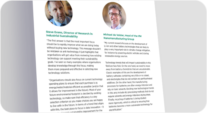 SUSTAINABILITY SPOTLIGHT | 24 SUSTAINABILITY SPOTLIGHT | 25 Technology perspective What e atest technology tren at i mpact sustainability? Steve Evans, Director of Research in Michael de Volder, Head of the IfM Dr Jagjit Singh Srai, Director of Research, Alexandra Brintrup, Professor in Digital Industrial Sustainability Nanomanufacturing Group and Head, Centre for International Manufacturing and Head of the Supply “The first answer is that the most important focus “My current research focuses on the development of Manufacturing Chain AI Lab: should be to rapidly improve what we are doing today Li-ion and other battery technologies that are likely to “Long-term technological trends show that advanced “Whilst sustainability needs to be first and foremost without buying new technology. This message shouldn’t play a very important role in climate-change mitigation, manufacturing technologies can create innovative about a cultural shift into being comfortable with be mistaken as anti-technology; it just highlights that for instance by powering electric vehicles and storing product designs by utilising new production methods. ‘less’, technological advances help this process. Within organisations will get value from reviewing how existing renewable energy sources. This holds great promise in terms of resource eciency. manufacturing significant advances are being made technology can support meeting their sustainability These advanced manufacturing technologies often with battery technology, alternative energy sources, goals. I’ve seen so many examples where organisations Technology trends that will impact sustainability in this involve less aggressive processing, making them both circular materials and production processes – and AI. develop knowledge through this focus, making field are two-fold. On the one hand, we need to move energy- and material-ecient. Other technologies that Our lab’s research aims to understand and improve them more prepared and eective in selecting new away from battery chemistries that are unsustainable. cover a broad spectrum of digital tools, such as AI, supply chains through the use of AI. Supply chains form technology solutions. Classic examples of this are the development of blockchain and others, will enable us to gain visibility both the backbone of the global economy and, at the battery cathodes containing very little or no cobalt, into demand and supply in our supply chain, allowing us same time, typically represent the largest environmental “Organisations should also focus on current technology and electrolytes that do not contain any perfluorinated to synchronise them more eectively. This, in turn, helps footprint of a manufacturing company. The most spending plans to ensure that each purchase is as additives. On the other hand, the manufacturing us to minimise waste and meet demand in the most promising advances we have made so far include Digital energy/water/material ecient as possible (and/or that processes for batteries are often energy-intensive and ecient manner.” Supply Chain Surveillance and Autonomous Systems. it allows for improvement in the future). Most of your rely on toxic solvents. Exciting new technological trends The first includes combining vast datasets from VAT, future environmental footprint is decided by existing in this area include dry processing methods that do not Dr Srai has extensive experience leading large-scale shipment, satellite imagery, and the web to train technology, so make sure that eciency is a key require solvents and energy-intensive drying steps. complex research projects comprising multiple stakeholders machine learning algorithms to predict the existence of selection criterion so you make choices you are happy Finally, recycling of batteries is being studied across industry, academia and public bodies. His research actors involved in a supply chain and their sustainability to live with in the future. In terms of a trend that aligns more rigorously, which is critical to ensuring that centre brings an engineering and strategic operations behaviours so that action can be taken to nudge them. management perspective to the design, analysis and with this, the best place to focus is data innovation – it batteries become a more sustainable technology for operation of international supply chains and the impact of The second area involves equipping a virtual replica oers the biggest sustainability improvement for the electrification.” advanced production and digital technologies. Through of a supply chain product or process. By automating least cost, and technologies that support sustainability major collaborations with industry (individual firms and planning, we alleviate the need for manual processes data insights are rapidly evolving.” Michael de Volder leads the IfM’s Nanomanufacturing consortia), primarily in the healthcare and food/FMCG and allow everyone to share resulting gains so they can Group, which focuses on developing scalable processes sectors, his research findings have directly underpinned major be incentivised.” Steve Evans leads the IfM’s Sustainability Association. to arrange nanoparticles such as carbon nanotubes organisational change. The association produced the “Sustainable Innovation: and graphene into well-defined superstructures. These Prof. Alexandra Brintrup is Professor in Digital Manufacturing Quick Wins in Sustainable Manufacturing” report, may find application in sensors, electronics, catalysis, at the Institute for Manufacturing, where she leads the which recommends how organisations can improve energy storage, water purification and smart materials. Supply Chain AI Lab. Prof. Brintrup was the first researcher to empirically study large-scale supply chains as complex sustainability performance quickly without investing adaptive networks, examine their emergent properties, and heavily in new technologies. take a data-driven perspective to characterise t
