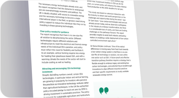 SUSTAINABILITY SPOTLIGHT | 28 SUSTAINABILITY SPOTLIGHT | 29 Findings traditional agriculture, and free up land for rewilding Decarbonising the energy supply and other environmentally advantageous purposes. Some CEA technologies require only a tenth of the The technologies can also reduce the risk of crop failure water of conventional agriculture, but a great deal of due to environmental influences, and they provide energy to perform what the sun does naturally, so the consistently high yields of food. To fully reap the key to more sustainable CEA lies in decarbonising the benefits of decarbonisation, the report authors urge thermal and electrical energy supply it relies on. action now. Investment timelines in CEA are 20–50 years, so current policy will influence the state of British The necessary energy technologies already exist, and food production at the 2050 deadline for net zero. the report recognises that the obstacles to widespread “This study was based on extensive interaction with use are overwhelmingly economic and political. The the industry to obtain real-world perspectives on the UK is ideally situated, with access to renewable energy challenges and opportunities facing the sector,” says MethodA broad range of energy-eciency measures were and the necessary technology to become a major Dr Sam Short. “Low-carbon technologies exist and are reviewed in the study, including:international player in the field, so growers need strong already proven today, and we observed a willingness To gain a comprehensive understanding of current and • maintenance and operations management (enhanced policy support to reduce the individual risks they run by emerging energy technologies, as well as trends in CEA investing in these growing technologies.in the industry to embrace transformation, but there energy supply and demand, the authors conducted routine maintenance and repair, and operations is a considerable lack of clarity, and there are funding expert interviews, desk-based research and a validation monitoring and control systems)challenges on the pathways forward. This report • equipment optimisation (high-eciency pumps Clear policy needed for guidanceprovides insights to assist both industry and policy- workshop with sector representatives, policy-makers and motors, high-eciency boilers/other thermal The report recognises that there is no one-size-fits- and technology experts. Tools used to assess the all solution to decarbonising the sector. Dierent makers in enabling a wider deployment of low-carbon dierent technologies included:energy generation, improved ventilation and cooling controlled environment agriculture.” systems) technologies require dierent solutions and • ‘fast-start’ strategic roadmapping• building/glasshouse structure and materials infrastructure to meet the electrical and thermal energy • the IfM’s Innovation Velocity Tool underpinned by needs of the individual CEA operation, and policy Dr Diana Khripko continues: “One of the radical the SWOT (strengths, weaknesses, opportunities and (system insulation, thermal screens, novel glazing dierences in moving away from fossil fuels towards technologies, and closed/semi-closed glasshouses)must reflect this need for flexibility and facilitate it. a low-carbon energy system is that there is no one- threats) analysis• energy storage (diurnal thermal energy storage, and As an example, vertical farming requires less energy • the marginal abatement cost curve (MACC) to help for heating than glasshouse-based CEA, and with a size-fits-all technology or solution, not even within visualise the cost/emissions benefits of dierent seasonal thermal energy storage solutions)one sector such as CEA. A future-proof and eective • enhanced crop production (optimised LED lighting warming climate the needs of the sector will start to transition pathway therefore requires a strategy that is technologies.duration and wavelengths, CO2 management, and include cooling as well as heating. flexible enough to embrace legacy and existing low- Data used in the study was primarily retrieved from selective crop breeding/genetic modification).carbon technologies, and potential future breakthrough Attracting and encouraging CEA technology innovations to align dierent industrial practices Defra, the Climate Change Agreement (CCA) scheme Evaluated energy generation and conversion investment from the National Farmers Union (NFU) and from Despite dwindling numbers overall, certain CEA and their specific requirements to locally available publicly available documents such as academic articles, technologies included CHP and boilers fired by renewable energy sources. alternative fuels, electrically powered technologies technologies, in particular indoor and vertical farming, grey literature, including white papers and government such as heat pumps and electrical boilers, as well are growing in popularity for investors who perceive documents, and industry reports.as heat recovery from waste heat and geothermal the practices as innovative technology ventures rather sources. These technologies were assessed based than agricultural techniques. In the UK the authorities’ “One of the key challenges in defining energy transition on seven factors: technical feasibility, commercial policy-encoded pledge to reach net zero by 2050 is pathways at the sectoral level lies in the requirement for feasibility; environmental performance; organisational driving investment in sustainable practices. The policy a systems-thinking approach. The selected approach requirements and capacity; suitability of existing framework for sustainable agriculture and horticulture, and underpinning tools need to enable a holistic policy, regulatory and fiscal incentives; societal value however, is too vague for many growers and investors evaluation of how altering the ecosystem, such as creation potential; and societal, consumer and retailer to see CEA as a safe choice.