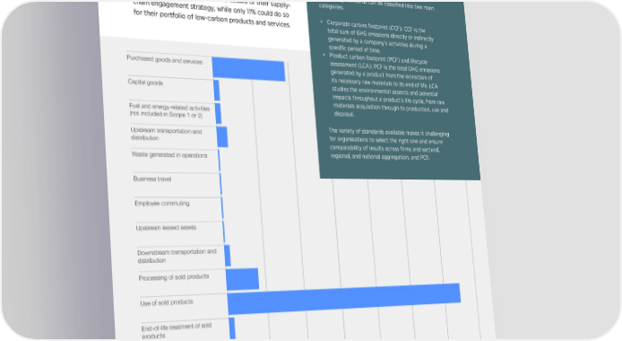 SUSTAINABILITY SPOTLIGHT | 38 SUSTAINABILITY SPOTLIGHT | 39 Why does Scope 3 matter?While industries such as cement and concrete, and Based on CDP data, Scope 3 category 1 (purchased How is Scope 3 calculated and reported? Scope 3 emissions can account for more than 70% of transport services and logistics, have lower Scope 3 goods and services) and Scope 3 category 11 (use of Carbon accounting standards underpin the a business’s carbon footprint, based on data from the emissions, this category becomes significant for other sold products) combined represent 84% of reported measurement and reporting of carbon emissions as UN Global Compact. Figure 2 highlights that dierent industries, including chemicals, electronics, automotive Scope 3 emissions (see Figure 3). However, reporting is well as the tracking of organisational performance and food. Consequently, any decarbonisation eorts in often incomplete, with many industries omitting several against abatement strategies and targets. Carbon industries face dierent Scope 3 situations and these sectors are likely to require intense cooperation Scope 3 categories. As indicated by the CDP, only 16% of accounting standards can be classified into two main challenges.among original equipment manufacturers (OEMs), organisations were able to share details of their supply-categories: consumer brand companies and suppliers.chain engagement strategy, while only 11% could do so • Corporate carbon footprint (CCF): CCF is the for their portfolio of low-carbon products and services. total sum of GHG emissions directly or indirectly generated by a company’s activities during a specific period of time. • Product carbon footprint (PCF) and lifecycle assessment (LCA): PCF is the total GHG emissions Purchased goods and services generated by a product from the extraction of its necessary raw materials to its end of life. LCA Capital goods studies the environmental aspects and potential impacts throughout a product’s life cycle, from raw Cement and concrete materials acquisition through to production, use and Fuel and energy-related activities disposal. Transport services and logistics(not included in Scope 1 or 2) The variety of standards available makes it challenging Paper and pulpUpstream transportation and for organisations to select the right one and ensure distribution comparability of results across firms and sectoral, Metals and mining regional, and national aggregation. and PCF. Waste generated in operations Other materials Business travel Chemicals Biotech, healthcare and pharmaEmployee commuting Food and beverage processing Upstream leased assets Apparel ConstructionDownstream transportation and distribution Light manufacturing Processing of sold products Transport OEMs Electric and electronic Use of sold products manufacturing Powered machinery End-of-life treatment of sold products 0%10%20%30%40%50%60%70%80%90%100% Downstream leased assets Scope 1Scope 2Scope 3 Franchises Source: Extracted from CDP and Capgemini Invent, From Stroll to Sprint: A Race Against for Corporate Decarbonization, July 2023; CDP, CDP Investments 0% 10% 20% 30% 40% 50% 60% 70% Figure 2. Source: Extracted from CDP and Capgemini Invent, From Stroll to Sprint: A Race Against Time for Corporate Decarbonization, July 2023; Figure 3. Note: The standards in each section are listed in alphabetical order. CDP, CDP Technical Note: Relevance of Scope 3 Categories by Sector, 2022.Source: High Value Manufacturing Catapult, Embodied Emissions and Net Zero, 2022.