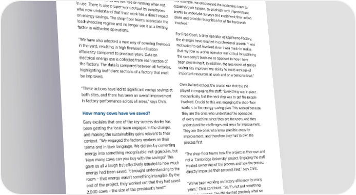 SUSTAINABILITY SPOTLIGHT | 14 SUSTAINABILITY SPOTLIGHT | 15 After 12 months, teams reported a 15%–30% reduction “This wasn’t about us coming in and telling them what The future is bright in thermal and electric energy consumption at both they need to do, then leaving. EPK had already been By engaging the local workforce, making sustainability sites. There was also a significant increase in tea engaging in various energy-saving activities. This was relevant and identifying simple steps that significantly produced per unit of fuel wood (kWh/m3). about walking alongside them, listening to them, and reduce energy consumption, the Cambridge Method is getting them involved. now in use at five EPK sites in Nandi Hills. “Now, there is the controlled start-up of machines after a power outage,” says Chris Ballard, Technical Director “For example, we encouraged the leadership team to Chris: “We have learnt that small actions lead to We have learnt of EPK. “No machines are left idle or running when not establish their targets, to establish local improvement tangible and significant improvements and that energy in use. There is also proper work output by employees teams to undertake surveys and implement their action saving can be achieved by involving all the personnel at that small actions who now understand that their work has a direct impact plans and provide recognition for all the hard work the shop-floor level.” on energy savings. The shop-floor teams appreciate the involved.” load-shedding regime and no longer see it as a limiting Gary: “Sustainability as a subject can feel large, not lead to tangible factor in withering operations. For Fred Oberi, a drier operator at Kepchomo Factory, engaging, and doesn’t often relate to individual day the changes have resulted in professional growth: “I was jobs. What we do with our methodology is to engage “We have also adopted a new way of covering firewood motivated to get involved since I was made to realise and signiocant in the yard, resulting in high firewood utilisation that my role as a drier operator was critical in sustaining the workers on their terms and in their language. We eciency compared to previous years. Data on the company’s business as opposed to how I have bring it to life. improvements. electrical energy use is collected from each section of been perceiving it. In addition, the awareness of energy “Companies that find they have a gap between the factory. The data is compared between all factories, saving has improved my ability to avoid wastage of sustainability ambition/strategy and gaining highlighting inecient sections of a factory that must important resources at work and on a personal level.” momentum/engagement with the factory shop floor be improved. would benefit from using the tool.” Chris Ballard echoes the crucial role that the IfM “These actions have led to significant energy savings at played in engaging the sta: “Everything was in place Chris concludes: “Since working with the IfM, everything both sites, and there has been an overall improvement mechanically, but the next step was to get the people we implemented has been continued. Shop-floor in factory performance across all areas,” says Chris. involved. Crucial to this was engaging the shop-floor workers now own the energy-saving culture. Some workers in the energy-saving plan. This worked because team members have now moved to other factories and How many cows have we saved? they are the ones who understand the operations EXPLORE Cambridge of every machine, since they are the users, and they are implementing these ideas in these factories. So, the Sustain 8 Gary explains that one of the key success stories has ideas and what we have learnt are spreading. We’re been getting the local team engaged in the changes understand the challenges and areas for improvement. working together eectively and committed to bringing and making the sustainability gains relevant to their They are the ones who know possible areas for our customers tea that has a minimal impact on the Cambridge Sustain 8 is an context. “We engaged the factory workers on their improvement, and therefore they had to own the environment.” organisational engagement terms and in their language. We did this by converting process first. programme focused on making energy into something recognisable: not gigajoules, but significant sustainability ‘How many cows can you buy with the savings?’ This “The shop-floor teams took the project as their own and gave us all a laugh but eectively equated to how much not a ‘Cambridge University’ project. Engaging the sta improvements with minimal energy had been saved. It brought understanding to the created ownership of the process and how the process investment. By bridging the gap room – that energy wasn’t something intangible. By the directly impacted their personal lives,” says Chris. between corporate objectives end of the project, they worked out that they had saved and sustainable practices on the 2,000 cows – the size of the president’s herd!” “We’ve been working on factory eciency for many years,” Chris continues. “So, it’s not just something factory floor, this approach has Gary recognises that local eorts have been mirrored that’s happened. The IfM clarified precisely what we been successfully implemented by a strong commitment from EPK HQ to try something should be doing, focusing on, and getting the factory in numerous factories, yielding new, as well as supportive managerial and technical personnel involved. measurable savings within just one leadership on the ground in Kenya: “The open and year of implementation. positive culture of the Kenyan factory management “We knew where all the problems were, but it’s getting and factory sta, coupled with our empathy and intentions turned into action, which is challenging, and understanding of ‘real’ factory challenges and sim